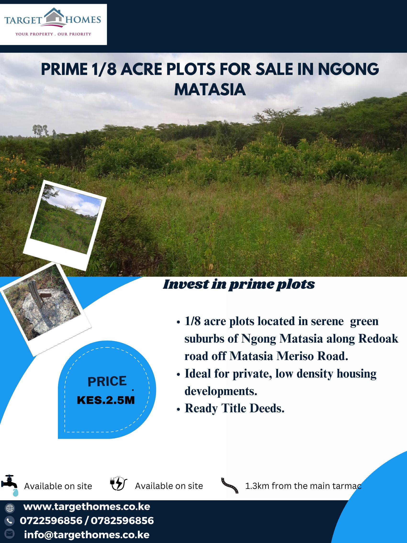 This 1/8 acre plots are located in the leafy suburbs of Ngong Matasia. The plots are situated along Red oak road off Matasia Meriso road and 1.3Km from the Main tarmac.